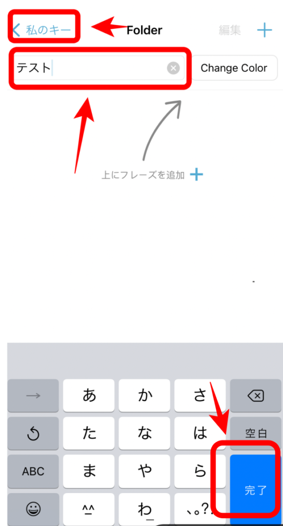 上の画像では赤枠で囲んだところに「テスト」と書いてますが、ここにフォルダ名を入力します。