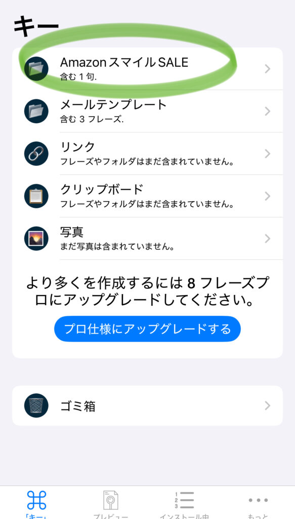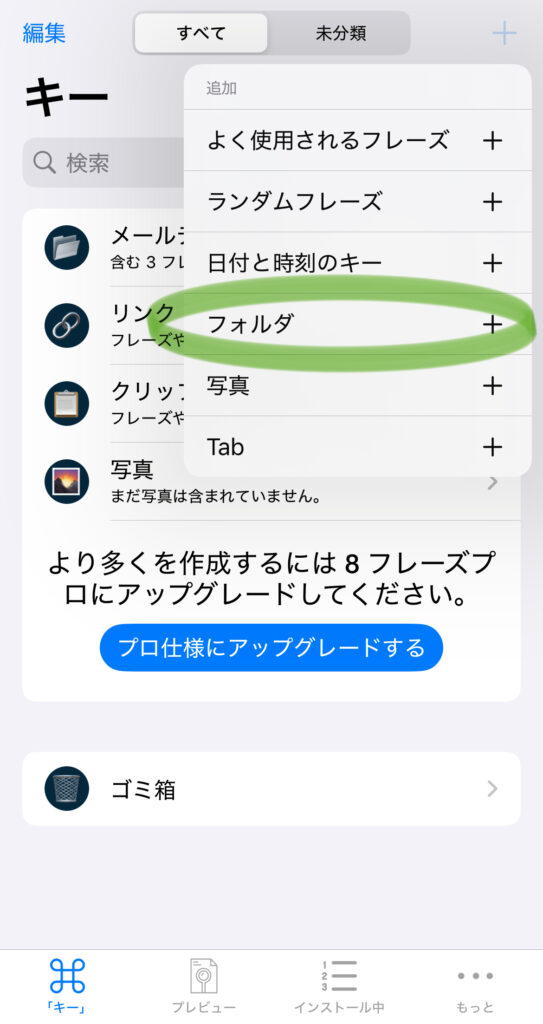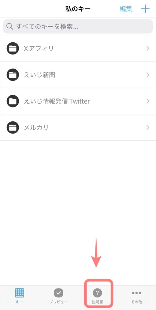登録したフォルダはLazyBoardのアプリで「キー」を開いた時のこの位置に表示されます。