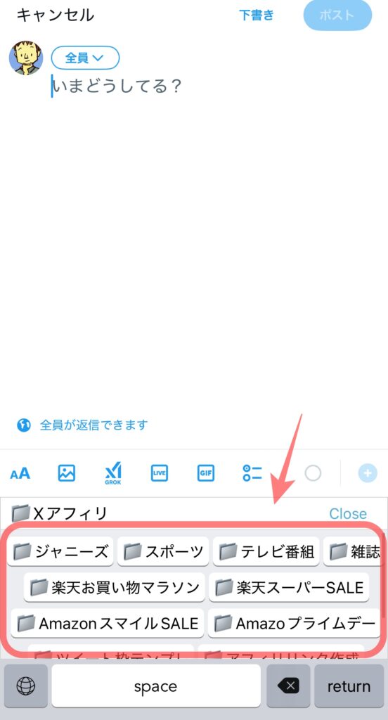 Xの投稿画面の部分に、あらかじめWordBoardに設定してあるテンプレート(ポストの型)が貼り付けられました。